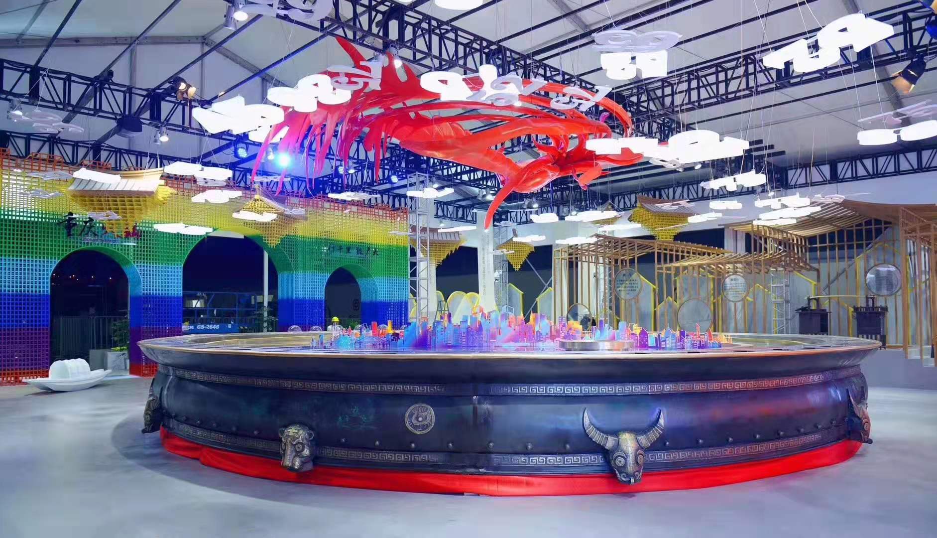 像個(gè)小型游泳池的鍋面被分成“紅湯”和“清湯”兩部分,沸騰著冒起泡泡和熱氣,迎來(lái)了各展團(tuán)的客商代表。商務(wù)部部長(zhǎng)助理任鴻斌和重慶市副市長(zhǎng)熊雪為這口以“非物質(zhì)文化遺產(chǎn)體驗(yàn)”名義來(lái)到會(huì)場(chǎng)的火鍋舉行開鍋儀式。