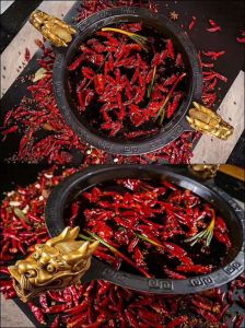 1.火鍋紅油(老油)的制作 取牛油(清油)或兩種的混合油100公斤,放入鍋中燒至170度,去除生油味,待溫度降至160度時,加入生姜片、大蒜各2-5公斤,用微火煎干去渣,再加入各3 -